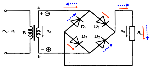 在变压器副边电压的正半周,D1、D3导通,D2、D4截止,电流i1方向如红色箭头所示。在电压的负半周时,电流i2方向如蓝色箭头所示。