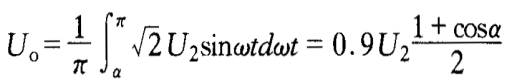 α=0,Uo=0.9U2,输出电压最高,相当于不可控二极管单相桥式整流电压;α=180°,Uo=0,可控硅全关断。负载电阻RL中整流电流的平均值为:
