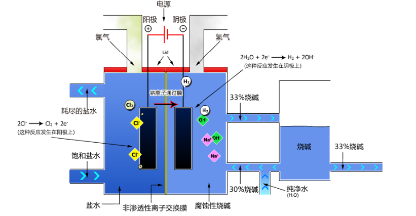 氢氧化钠(烧碱)精制的饱和食盐水进入阳极室;纯水(加入一定量的NaOH溶液)加入阴极室,通电后H2O在阴极表面放电生成H2,Na+则穿过离子膜由阳极室进入阴极室,此时阴极室导入的阴极液中含有NaOH;Cl-则在阳极表面放电生成Cl2。电解后的淡盐水则从阳极室导出,经添加食盐增加浓度后可循环利用。阴极室注入纯水而非NaCl溶液的原因是阴极室发生反应为2H++2e-=H2↑;而Na+则可透过离子膜到达阴极室生成NaOH溶液,但在电解开始时,为增强溶液导电性,同时又不引入新杂质,阴极室水中往往加入一定量NaOH溶液。