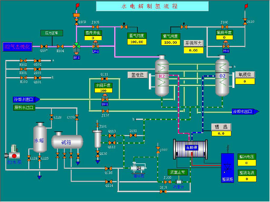 中压电解水制氢装置是一组可以安全可靠地连续生产氢气的成套设备,它采用工作温度为70~85℃的碱性水溶液电解装置。此外,制氢站还包括纯水制备,氢气和氧气的储存、纯化、压缩输送设备以及有关控制仪表和电源等。制氢装置基本由七个系统组成:1,气体系统 2,电解液循环系统 3,气体排空(氮气置换)系统 4,原料补充系统 5,冷却水系统 6,排污系统 7,补碱系统